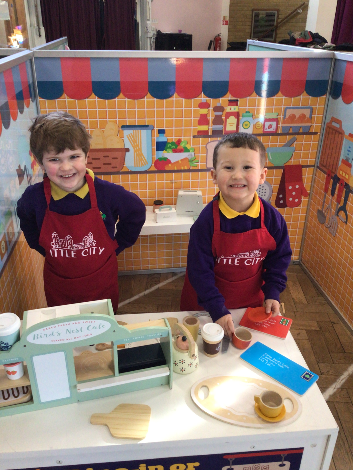 "We had a fantastic time at our Little City workshop, which linked to our 'When I Grow Up' topic. The hall was set up with a range of role play areas including a vets, doctors, supermarket, café, school, post office, construction site, police station and a hair salon. The children loved dressing up and exploring all the different areas!"
